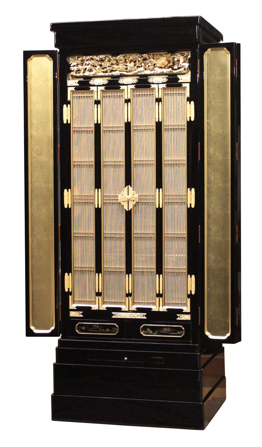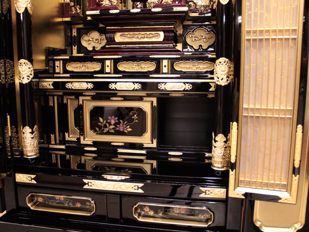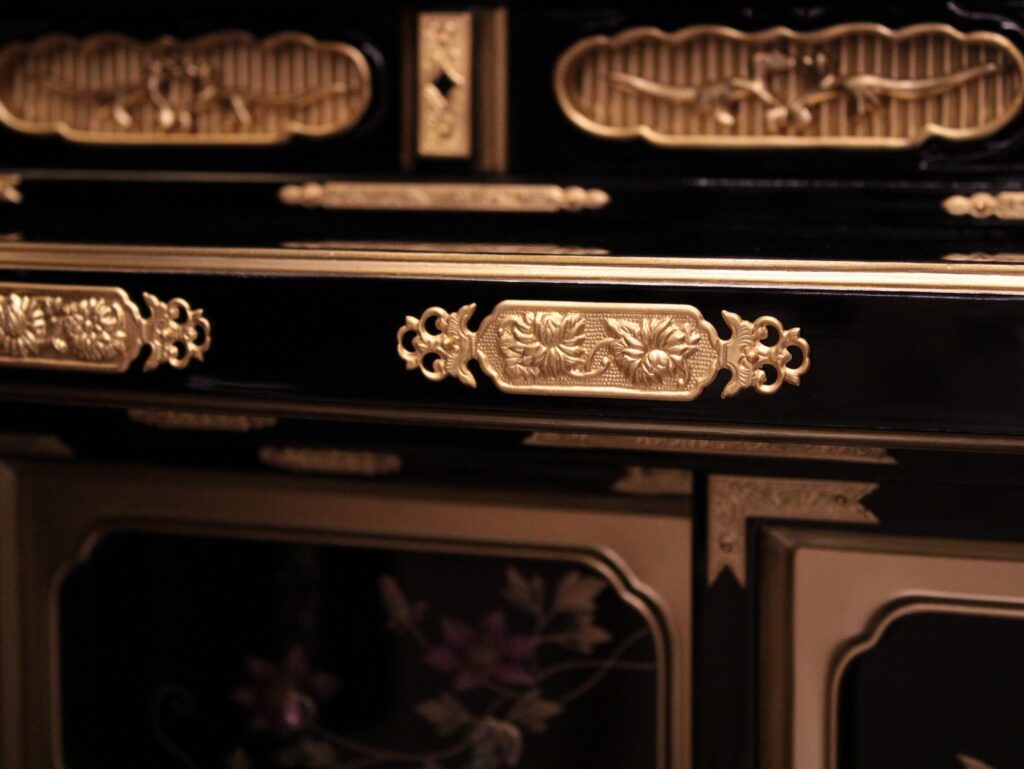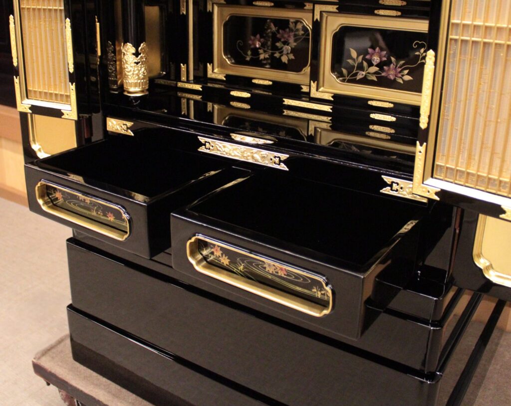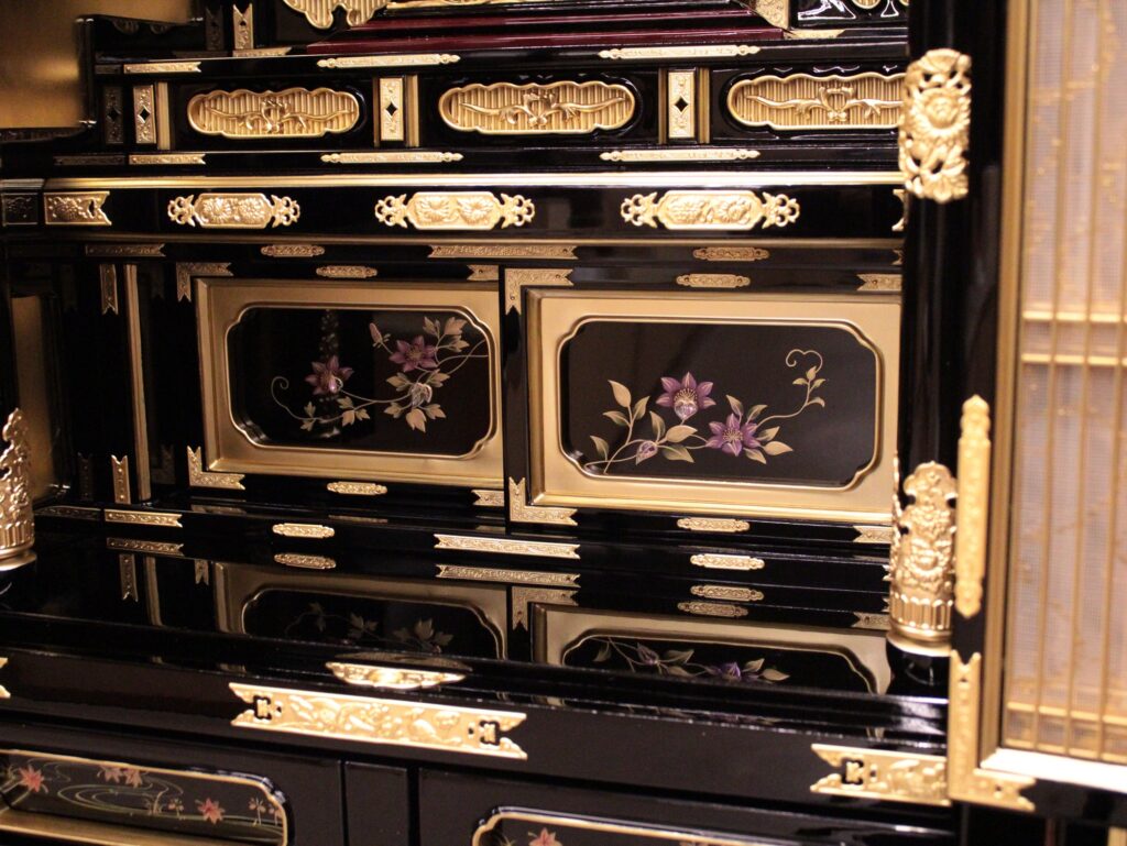 下段奥の戸袋や引き出しの正面板に伝統技法【蒔絵】が施され一つ一つ職人の手で細部まで描かれています。戸袋の正面板のデザインはテッセンの図柄が描かれています。
