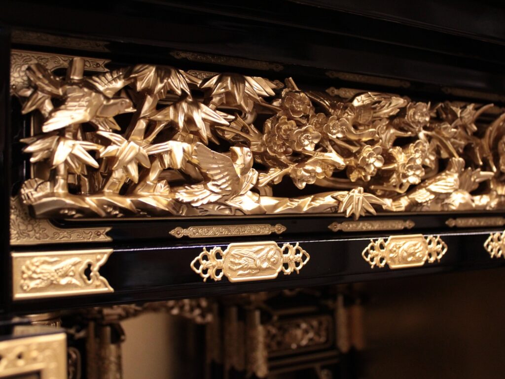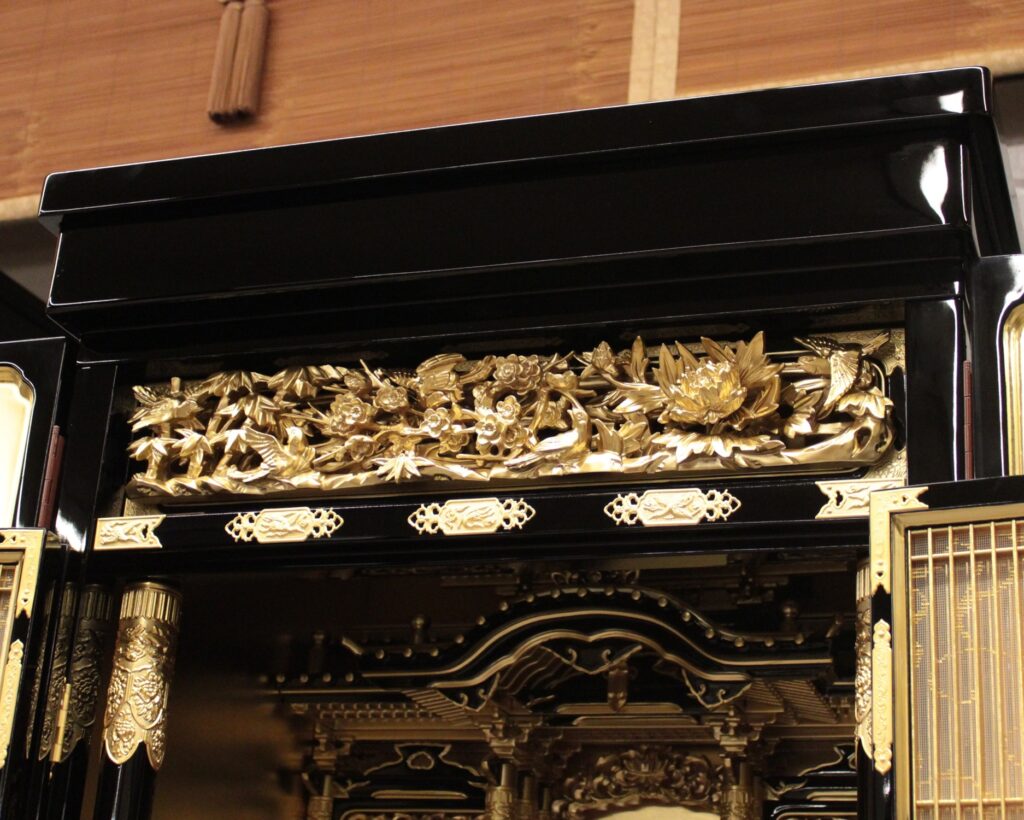 仏壇の顔ともいえる欄間(ランマ)の木彫り彫刻は花鳥図柄のデザインが繊細に刻まれていています。