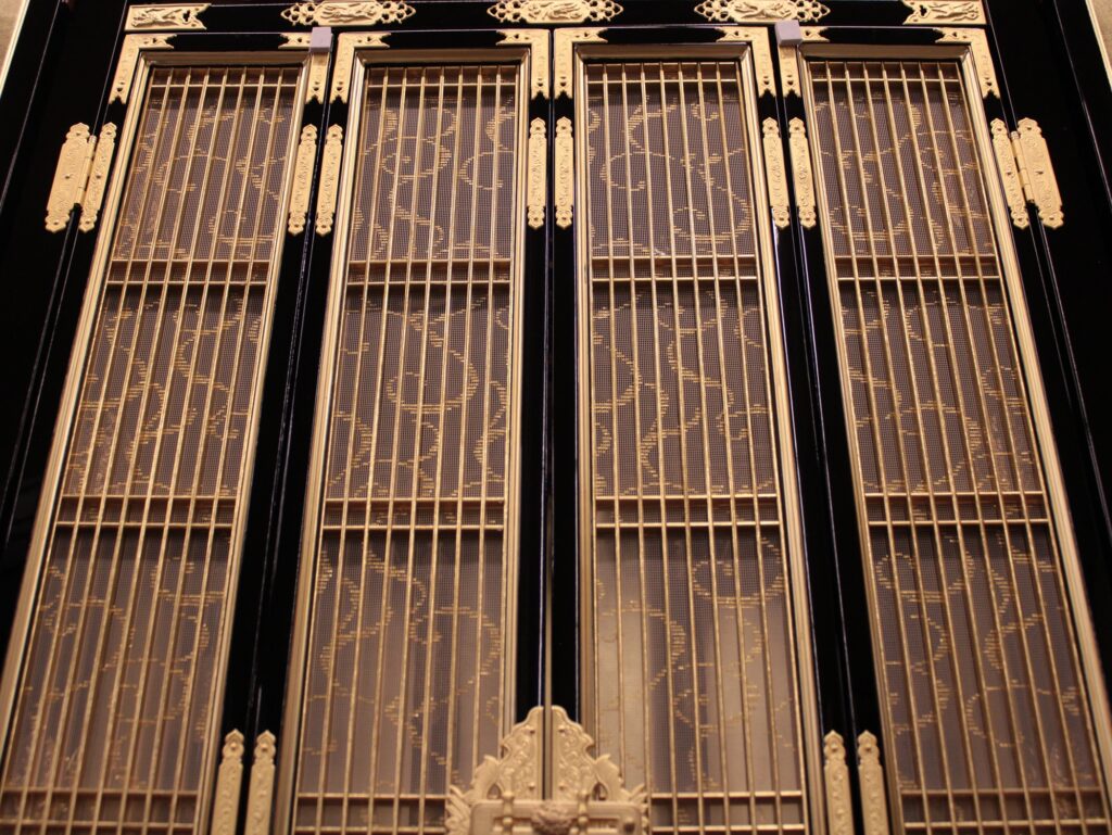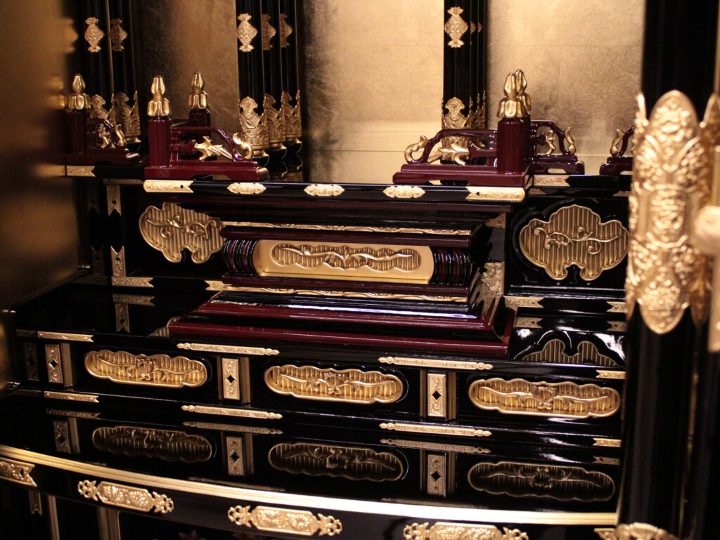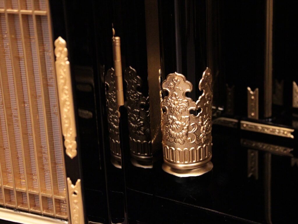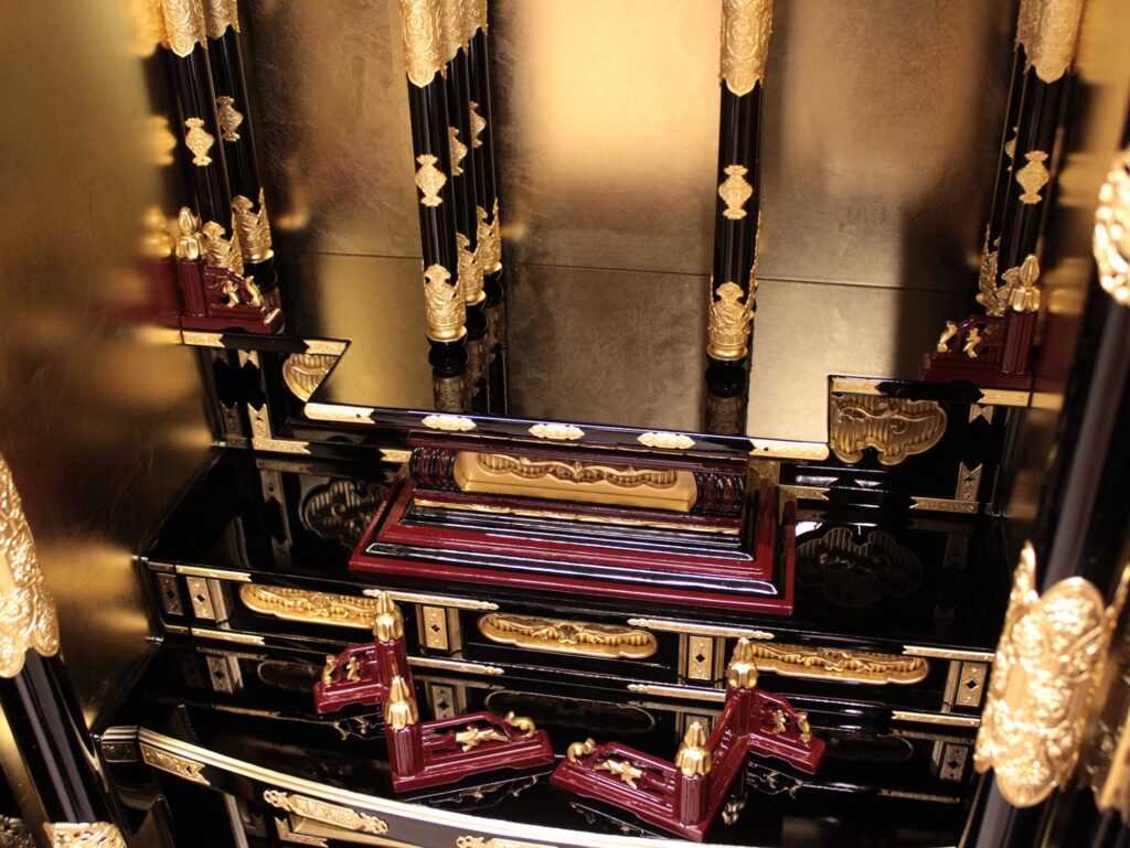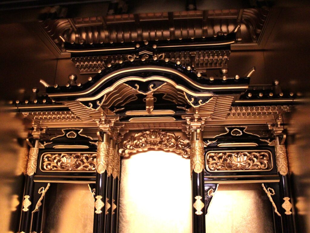 仏壇内部の屋根や柱は宮殿(くうでん)と呼ばれ東本願寺の山門を模した二重屋根が設置されその下に阿弥陀如来が安置されます。