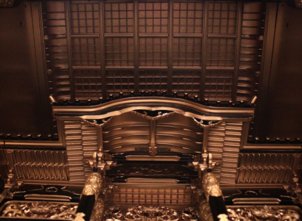 天井は細かい格子が一面に張り巡らされた折り上げ合天井になっていてお寺の内部天井を模して造られています。