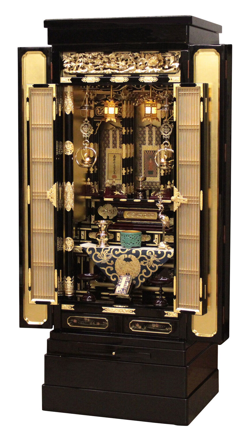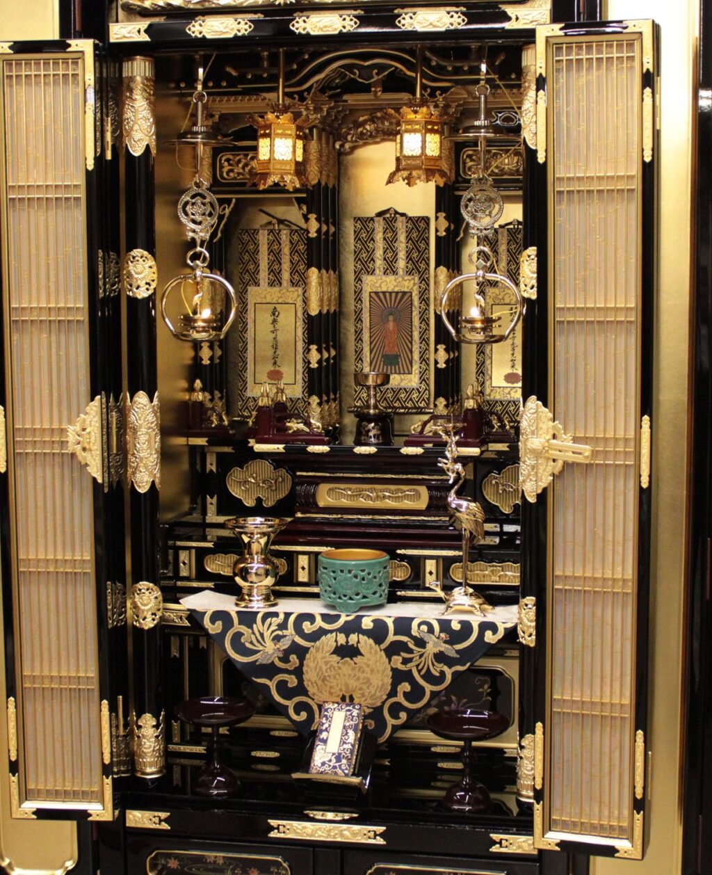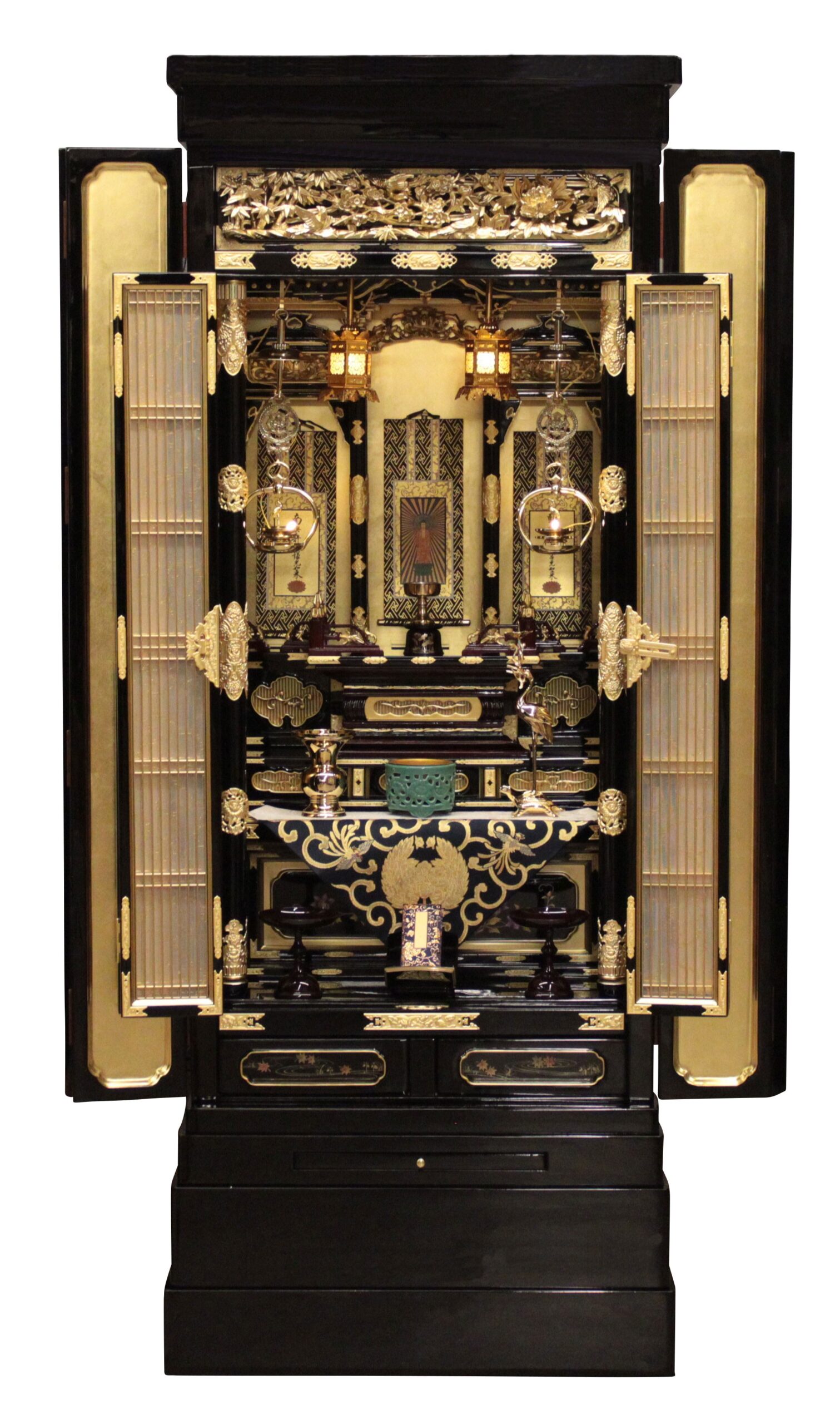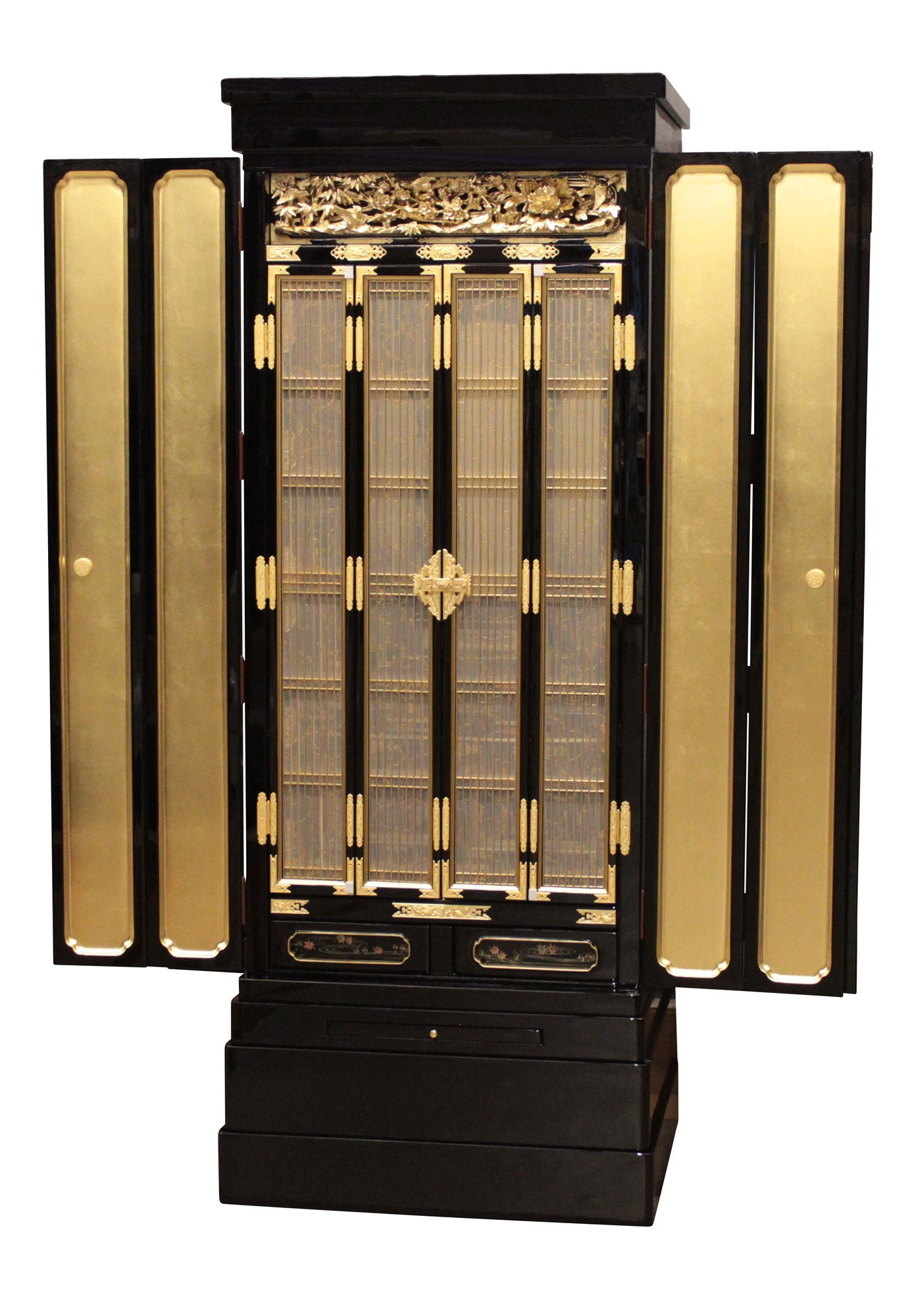 伝統技術で製作された京型の真宗本願寺派東本願寺の金仏壇です。光沢感のある漆黒のカシュー漆塗りで仕上げられ、金沢産100%の本金箔が仏壇内部に施され豪華な輝きと共に圧倒的な存在感を誇ります。戸袋の正面板には鉄線の図柄が伝統技法【蒔絵】で美しく描かれています。仏壇の顔ともいえる欄間(ランマ)の木彫り彫刻は花鳥図柄のデザインが繊細に刻まれていています。東本願寺の山門を模した豪華な二重屋根を持つ真宗大谷派伝統の金仏壇です。
