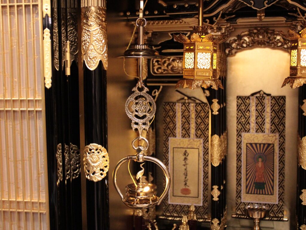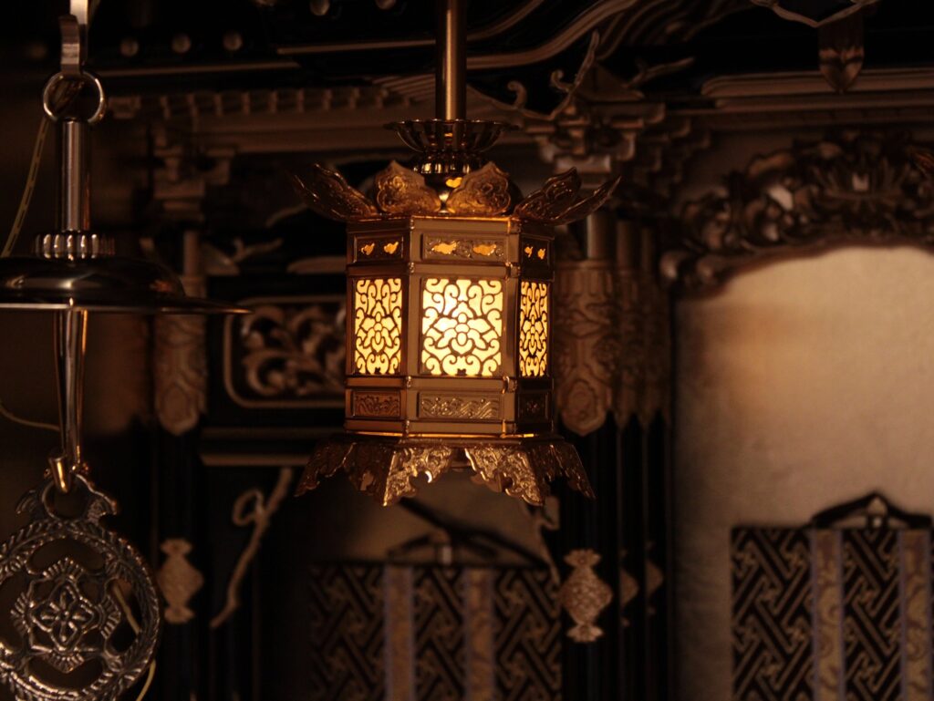 ・仏壇内部の天井から吊り灯篭や輪灯が吊り下げられています。吊り灯篭は浄土真宗の正式な六角の吊り灯篭がついています。