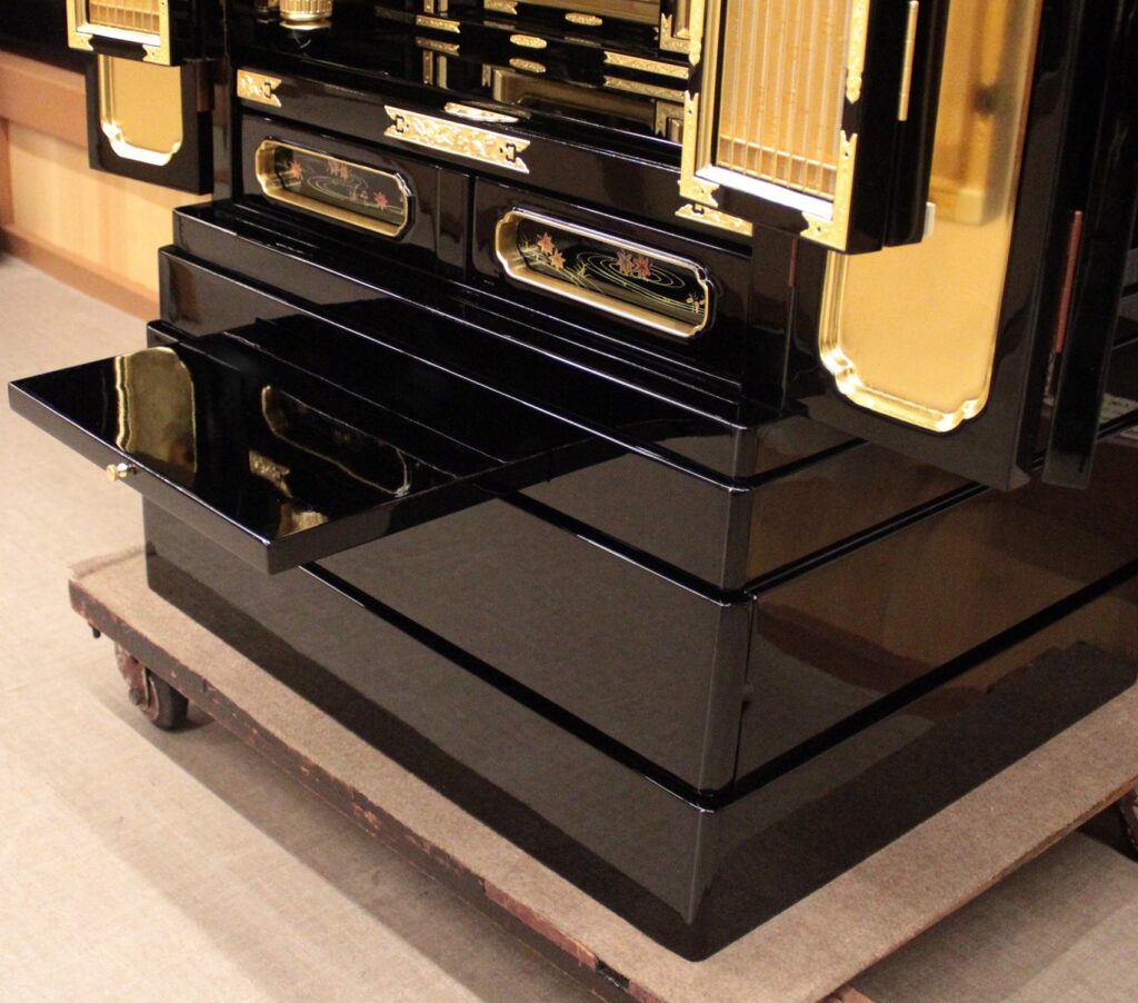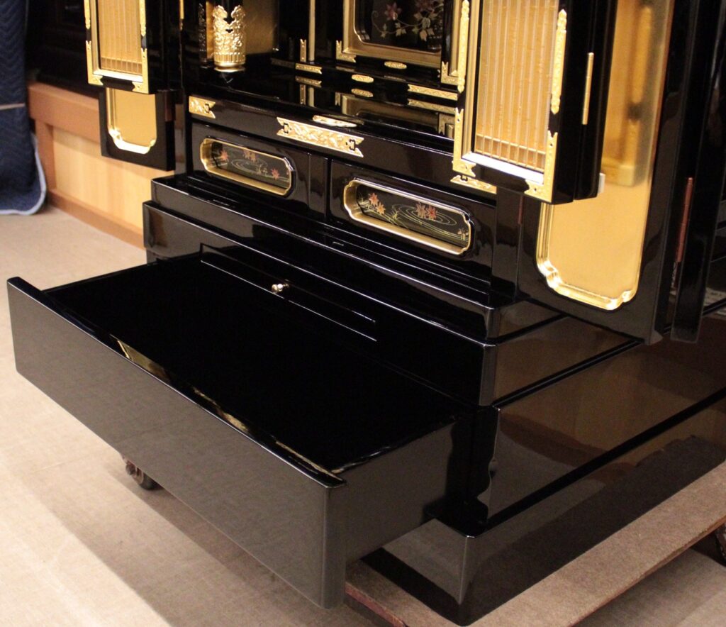 ・下台部分に大きな大引き出しがついています。色々な仏具を収納して頂けます。