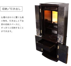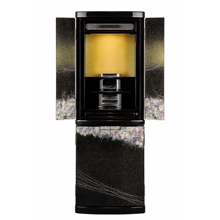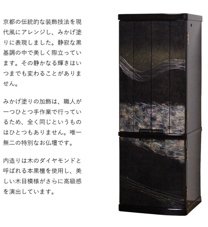 京都の伝統的な装飾技法を現代風にアレンジし、みかげ塗りに表現しました。静寂な黒基調の中で美しく際立っています。その静かなる輝きはいつまでも変わることがありません。みかげ塗りの加飾は、職人が一つひとつ手作業で行っているため、全く同じというものはひとつもありません。唯一無二の特別なお仏壇です。仏壇本体部や内造りは木のダイヤモンドと呼ばれる本黒檀を使用し、美しい木目模様がさらに高級感を演出しています。